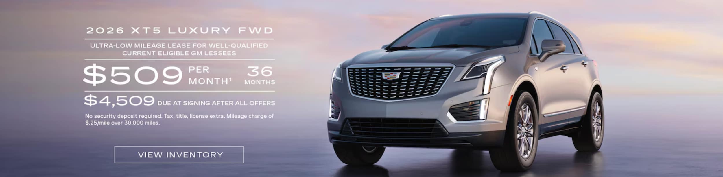 Disclaimer: 1. Must be a current lessee of a 2021 model year or newer GM vehicle through GM Financial or Cadillac Financial for at least 30 days prior to the new vehicle sale. Payments are for a 2026 XT5 Luxury FWD with an MSRP of $46,595. 36 monthly payments total $18,324. Total Lease Cost is $22,297.86. Lease based on net capitalized cost of $39,556.90 including down payment of $4,000 and $4,500 in applied incentives. Closed-end lease. Option to purchase at lease end for an amount to be determined at lease signing. Cadillac Financial/GM Financial must approve lease. Take new retail delivery by 3/2/26. Mileage charge of $.25/mile over 30,000 miles. Late payment and early termination fees apply. Lessee is responsible for insuring the lease vehicle. Lessee pays for maintenance, repair, excess wear and disposition fee of $595 or less at end of lease. Not available with some other offers. © 2026 General Motors. Cadillac Financial and the Cadillac logo are trademarks and/or service marks of General Motors LLC, used with permission. Cadillac Financial is a division of GM Financial. All Rights Reserved. Cadillac® XT5®
