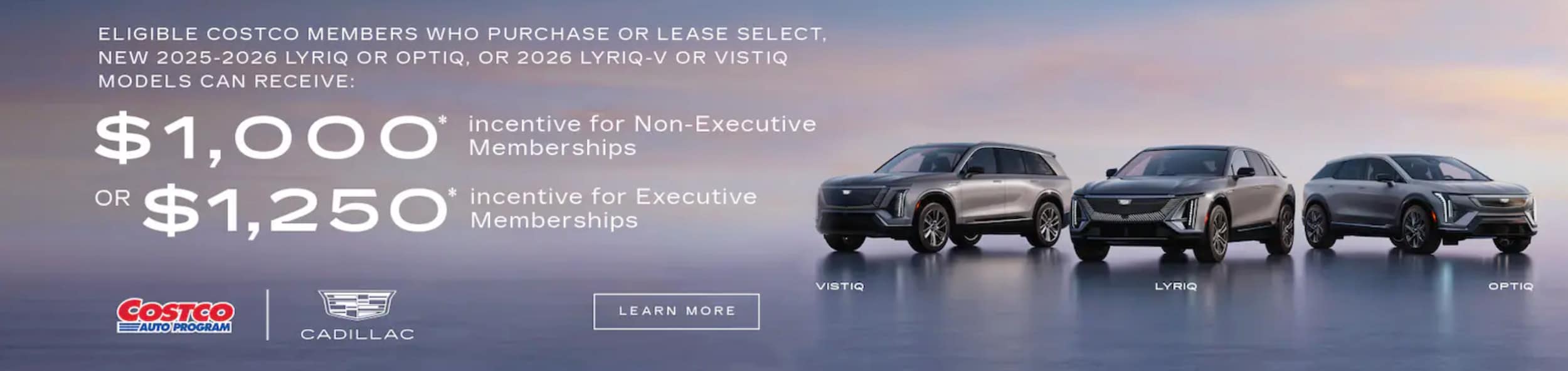 Disclaimer: * Excludes 2026 OPTIQ-V. To qualify for the Cadillac Limited-Time Special, you must: (1) be a current Costco Member by January 2, 2026; (2) register with Costco Auto Program online or through its call center by March 2, 2026, to receive a certificate with your unique promotion code; (3) present your certificate and unique promotion code to any Cadillac dealer at time of visit; (4) take delivery between January 3, 2026 and March 2, 2026, of a new 2025, 2026 Cadillac OPTIQ, LYRIQ; 2026 VISTIQ, LYRIQ-V to receive a $1,000 non-Executive Costco member-only incentive or $1,250 Executive Costco member-only incentive. Incentive will be applied at time of eligible purchase or lease and is compatible with current eligible manufacturer incentives for which you qualify. Incentive is subject to change due to vehicle inventory availability. Visit costcoauto.com/cadillac for full details. Costco and its affiliates do not sell automobiles or negotiate individual transactions.